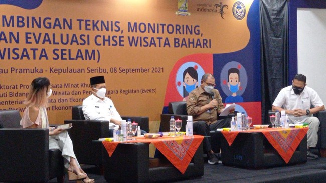 Dilihat detikTravel dari siaran persnya, Kamis (9/9/2021), Kementerian Pariwisata dan Ekonomi Kreatif/Badan Pariwisata dan Ekonomi Kreatif (Kemenparekraf/Baparekraf) menggelar kegiatan 'Bimbingan Teknis, Monitoring, dan Evaluasi CHSE Wisata Bahari (Wisata Selam)' di Pulau Pramuka, Kepulauan Seribu, DKI Jakarta pada Rabu kemarin.