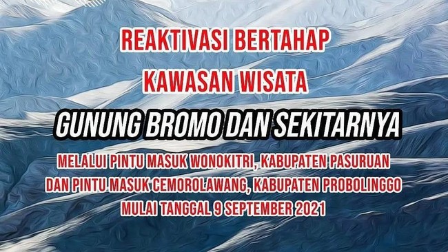 Pembukaan wisata Gunung Bromo, bisa melalui pintu masuk di Kabupaten Pasuruan dan Kabupaten Probolinggo, namun pembukaan wisata Gunung Bromo, diberlakukan protokol kesehatan ketat, pengunjung wajib pakai masker dan wajib menunjukkan sertifikat vaksinasi minimal vaksinasi pertama, dengan aplikasi PeduliLindungi.