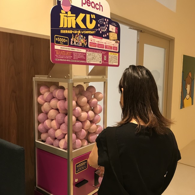 Memadukan konsep game gacha, traveler yang main di vending machine ini bisa mendapatkan hadiah berupa tiket pesawat PP ke berbagai destinasi yang dilalui oleh Peach Aviation. Vending machine ini diberi nama lotre perjalanan atau Tabikuji.
