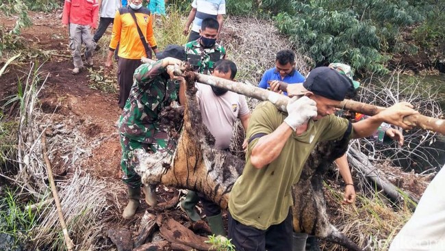 Seekor harimau Sumatera ditemukan sudah tidak bernyawa di Desa Tanjung Leban, Kecamatan Bandar Laksamana, Kabupaten Bengkalis, Provinsi Riau, Minggu (17/10/2021). Harimau itu terjerat.