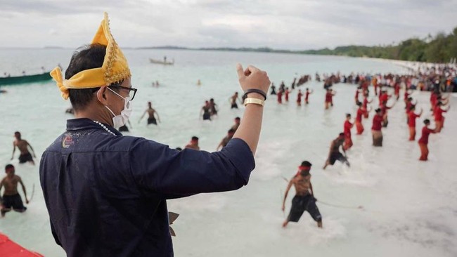 Menteri Pariwisata dan Ekonomi Kreatif Sandiaga Salahuddin Uno kagum dengan adanya Pantai Ngurbloat yang ada di Desa Wisata Ngilngof, Kecamatan Manyeuw, Kabupaten Maluku Tenggara, Maluku.