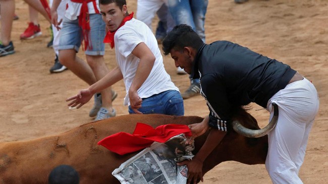 Pria tersebut diketahui menderita pendarahan, sampai akhirnya dinyatakan meninggal dunia, setelah diseruduk seekor banteng yang dilepas di jalanan selama festival berlangsung.