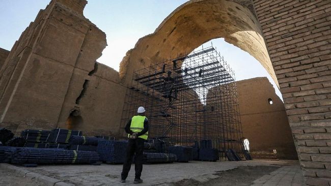 Arch of Ctesiphon yang berusia 1.400 tahun di Irak, lengkungan batu bata terbesar di dunia, sedang direstorasi sebagai bagian dari upaya untuk mengembalikan rupa megahnya, kata pihak berwenang Rabu (24/11).