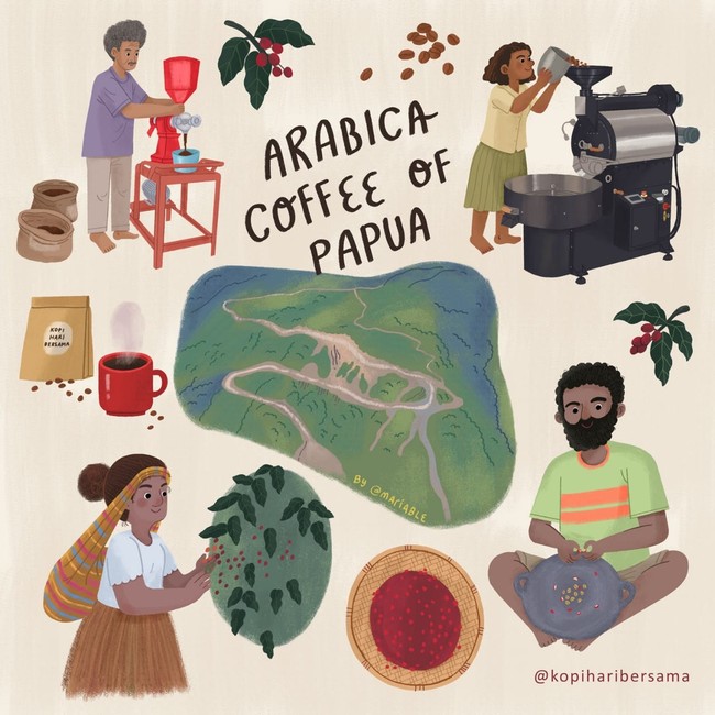 Kopi Hari Bersama juga bertujuan untuk mengenalkan kopi Papua pada dunia. Hasil karya ilustrator milenial ini diunggah dalam Instagram @kopiharibersama, gambar merupakan bahasa universal yang paling mudah dipahami di seluruh dunia.