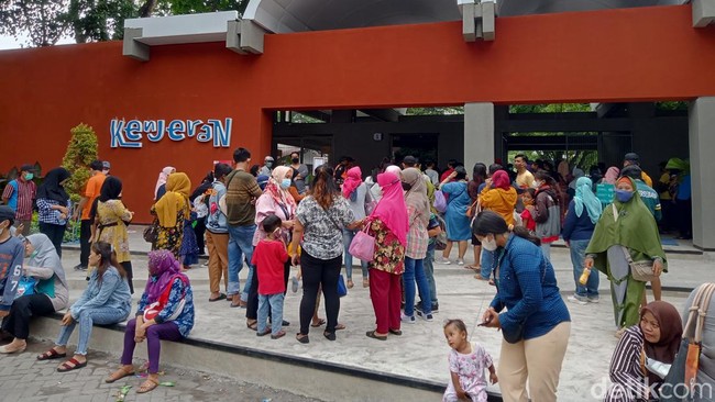 Sedangkan di lokasi wisata, ratusan pengunjung tampak berjubel antre di depan pintu masuk pantai. Antrean tak terhindarkan sehingga tampak mengular panjang.
