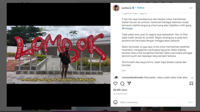 Sebelumnya, Menteri Pariwisata dan Ekonomi Kreatif Sandiaga Uno mengajak Muhammad Iqbal berlibur ke Mandalika, Nusa Tenggara Barat.