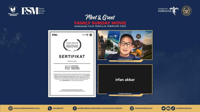 Menparekraf Sandiaga Uno berkesempatan memberikan sertifikat sebagai bentuk apresiasi atas kerja keras tim produksi dalam menghasilkan film pendek yang berkualitas. Sementara bagi peserta yang belum terpilih, Sandiaga berharap agar tidak berkecil hati. Sebab, program Family Sunday Movie 2022 masih akan terus berlanjut setiap bulannya hingga Oktober 2022.