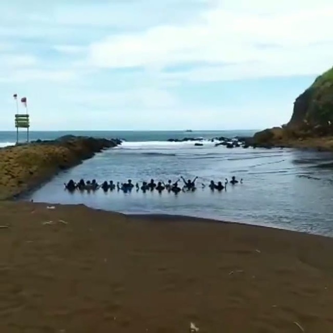 Dalam video berdurasi 30 detik itu, tampak belasan orang berendam di bibir pantai. Tampak sesekali tangan mereka menengadah ke atas langit.