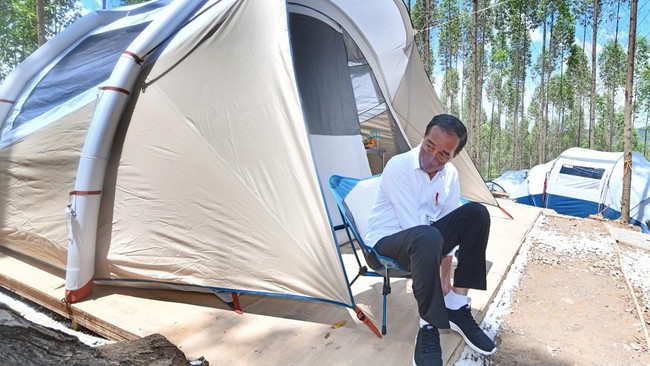 Presiden Joko Widodo dipastikan akan berkemah di lokasi Ibu Kota Nusantara (IKN) pada malam ini, Senin (14/3/2022). Dalam foto yang diabadikan fotografer kepresidenan, tampak Jokowi telah mendirikan tenda berwarna putih yang dibangun di bawah pepohonan tinggi hutan Kalimantan.