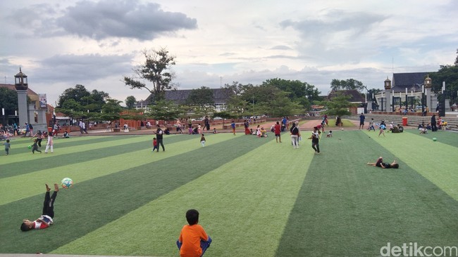 Berbagai macam aktivitas masyarakat terlihat di sana. Ada yang asyik berswafoto, sekadar mengobrol, bahkan bermain bola di rumput sintetis.