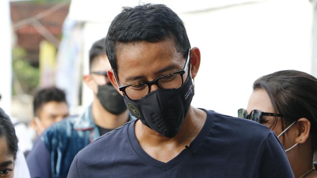 Sandiaga Uno tampak mengenakan jaket berwarna ungu dengan logo Wonderful Indonesia di depan dan tulisan Lake Toba #DiIndonesiaAja. Ia berjalan menuju arah restoran didampingi Wakil Tetap RI Untuk PBB Arrmanatha Nasir.