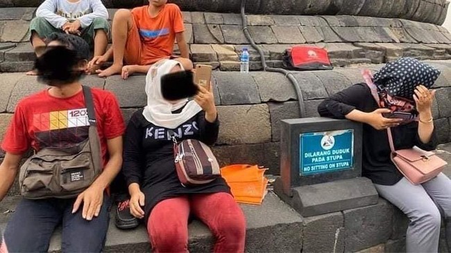 Dari foto-foto yang tersebar di media sosial Twitter, terlihat ada sejumlah wisatawan yang dengan santainya duduk-duduk di atas stupa candi Borobudur.