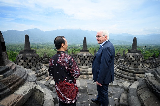 Presiden Jerman Frank-Walter Steinmeier mampir ke Candi Borobudur. Ia meninjau candi itu setelah pemerintah Jerman memberi bantuan perawatan Borobudur.