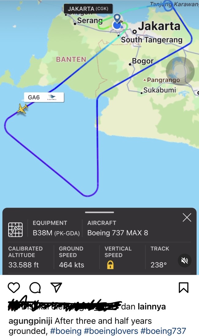 Pesawat Boeing 737 Max 8 milik Garuda Indonesia mengangkasa kembali. Seorang pecinta penerbangan merekam momennya di aplikasi pelacak penerbangan.