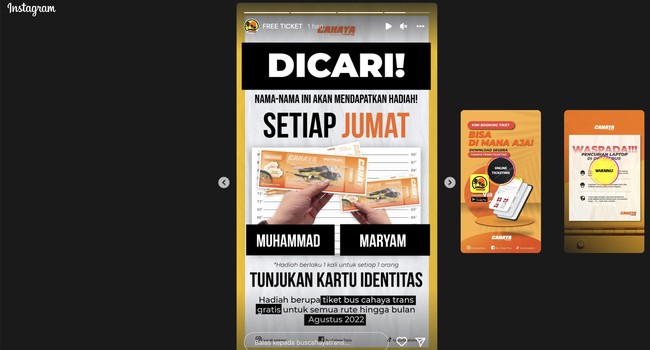 Tiket gratis itu ditawarkan oleh PO Bus Cahaya Trans pada sehari lalu. Mereka mengunggahnya di stories Instagram dan masih dipajang seperti dilihat detikTravel Kamis (30/6/2022).
