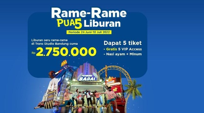 Tak hanya itu, hanya dengan Rp 2.750.000 kamu dan keluarga akan mendapatkan 5 tiket masuk untuk semua usia, 5 VIP access, dan 5 paket nasi ayam dan minum. Adapun periode promo tersebut berlangsung mulai dari 14 Juni hingga 10 Juli 2022.
