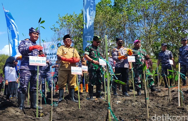 "Memperingati Hari Mangrove se-dunia yang jatuh 26 Juli sekaligus memperingati HUT Kemerdekaan RI ke-77," kata Komandan Lanal Banyuwangi Letkol Laut (P) Ansori.