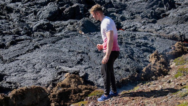 Pria ini mencoba untuk menikmati keindahan Gunung Fagradalsfjall dengan memanggang marsmallow. Benar saja, hanya dipanggang sebentar marsmallow sudah gosong.