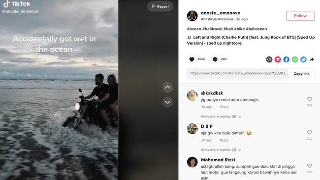 Bule itu mengunggah aksinya di akun TikTok @anaste_amanova. Dalam unggahan tersebut, dia bersama teman lelakinya menunggang motor di atas pasir dan menerjang ombak.
