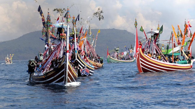Barisan puluhan kapal beraneka motif dengan ragam warna dan aksesoris melaju di perairan Muncar. Juga diselingi melarung sesaji. Tersaji dalam petik laut.