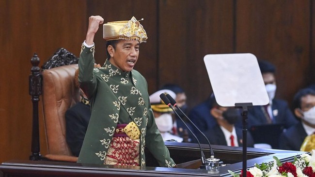 Jokowi menyampaikan pidato kenegaraan dan keterangan pemerintah terkait RUU APBN 2023 dan Nota Keuangan dalam Rapat Tahunan MPR dan Rapat Bersama DPR & DPD RI, Selasa (16/8/2022).