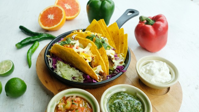 Beef Fajita Tacos merupakan salah satu makanan tradisional khas Meksiko yang mendunia. Terbuat dari tortilla yang diisi dengan bahan daging sapi, sayur-sayuran seperti selada, bawang bombay, dan tomat yang dimasak dengan jus jeruk, cuka, bawang putih dan bumbu Fajita, olahan ini menjadi salah satu kudapan favorit di Indonesia.
