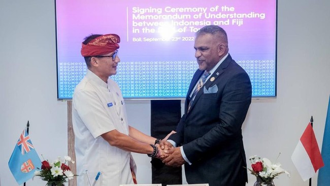 Penandatanganan nota kesepahaman (MoU) dilakukan Menparekraf Sandiaga Uno dengan Menteri Perdagangan, Perdagangan, Pariwisata dan Transportasi Republik Kepulauan Fiji Faiyaz Siddiq Koya di sela-sela pertemuan kedua Tourism Working Group (TWG) yang berlangsung di Grand Hyatt Hotel, Nusa Dua, Bali, Jumat (23/9/2022).