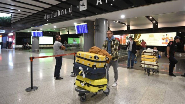 Seorang warga Rusia yang kabur ke Armenia, Dmitri, terlihat hanya membawa satu tas kecil ketika tiba di bandara. Ia mengaku harus meninggalkan istri dan anaknya di Rusia demi menghindari wajib militer.