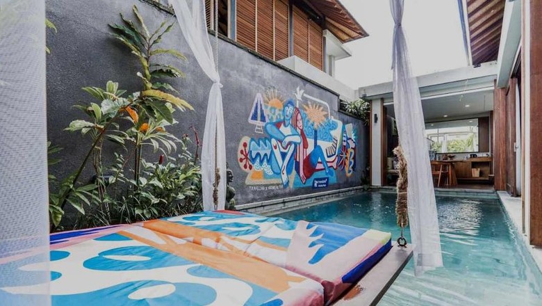 Tak cuma mural instagrammable, tapi juga bantal, kolam renang, sampai ke kamar mandinya penuh dengan karya seni.