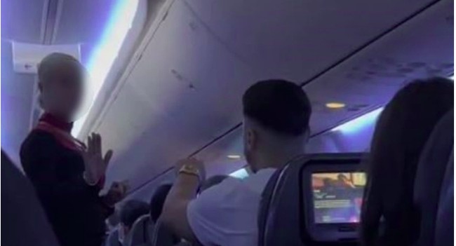 Seorang pramugari yang berada di belakang pria ini, mulai merekam pertengkaran tersebut.