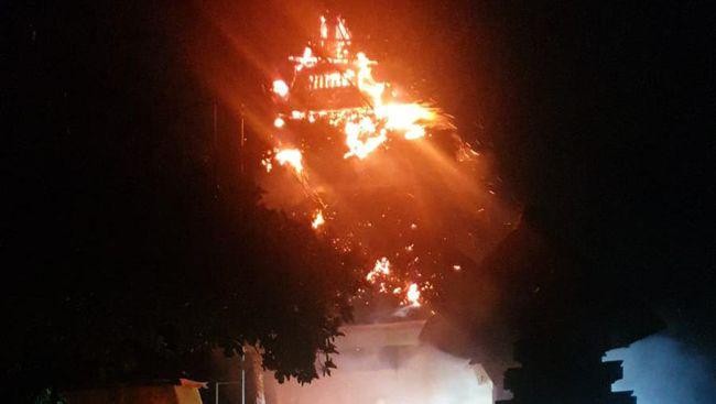 Alhasil para pamedek yang tengah berada di area utama mandala pura kaget. Percikan api tiba-tiba terlihat di ujung tumpang atau puncak palinggih.