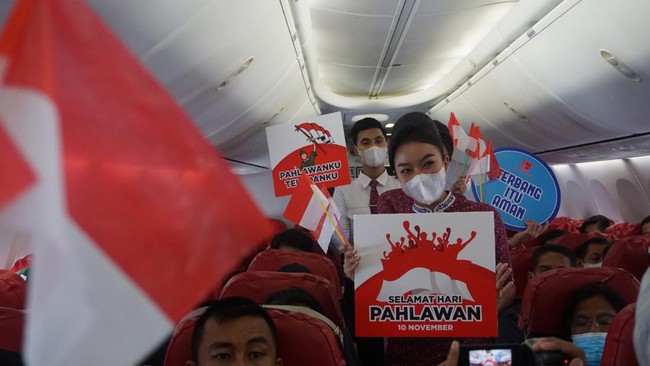 Mengusung tema 'Pahlawanku, Teladanku!', Lion Air mengadakan acara peringatan Hari Pahlawan ke-77 di dalam penerbangan JT-694 rute Bandara Internasional Soekarno-Hatta di Tangerang, Banten (CGK) tujuan Bandara Internasional Juanda Surabaya di Sidoarjo, Jawa Timur (SUB).
