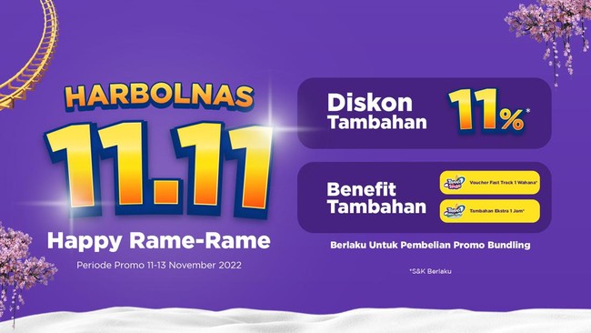 Berikut harga tiket promo Harbolnas 11.11 diskon paket bundling + diskon 11%. Periode promo 11-13 November 2022: