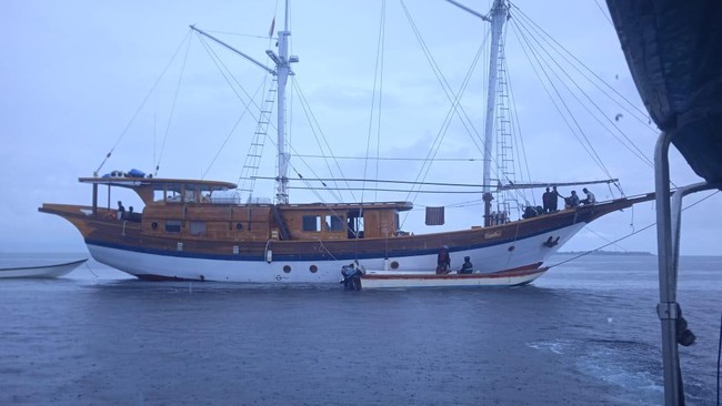 Kapal Phinisi KLM Leyla yang membawa 4 turis asal Amerika, Belanda, hingga Italia kandas di Perairan Saonek Raja Ampat, Papua Barat. Begini kronologinya: