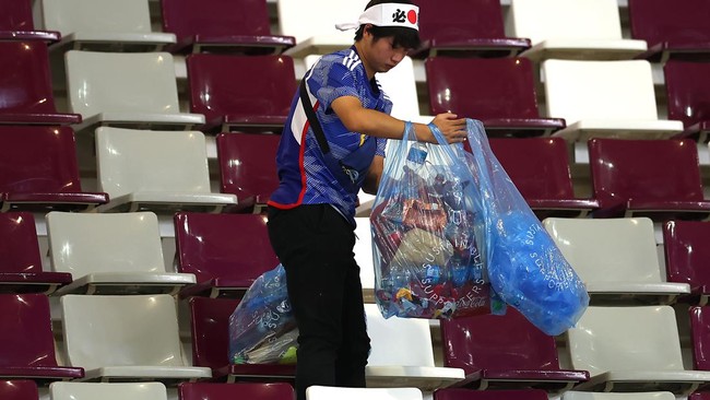 Plastik biru muda keluar dari saku dan tas penonton. Fans Jepang memunguti sampah yang tercecer di sekitar mereka. Sedikit demi sedikit, lama-lama menjadi bukit, jajaran plastik biru mulai terlihat di bangku-bangku stadion.