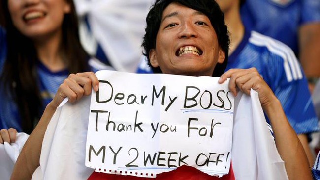 Akun resmi FIFA World Cup membagikan sebuah foto yang unik dan menarik di akun Twitternya. Foto itu menampilkan seorang fans sepakbola asal Jepang yang membentangkan sebuah spanduk sederhana dengan tulisan yang cukup menyentil.