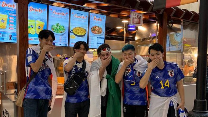 Aksi tutup mulut pemain Jerman sebelum pertandingan itu ternyata dibalas oleh olok-olok fans timnas Jepang. Dari foto yang viral di media sosial Twitter, terlihat ada 5 orang fans timnas Jepang yang berpose tutup mulut ala-ala pemain Jerman.