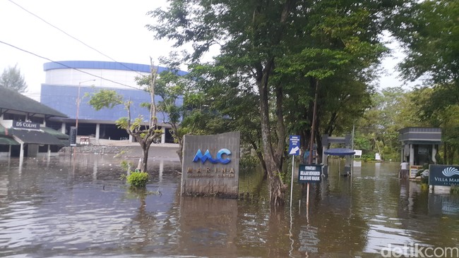 Pantauan detikJateng pukul 09.00 WIB, Jumat (30/12/2022), terlihat banjir di masih merendam jalan pintu loket Pantai Marina atau depan gerbang Marina Convention Center (MCC).