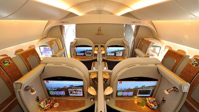 "Pesawat A380 yang sepenuhnya diperbarui menghadirkan produk dan interior terbaru Emirates di seluruh kabin, termasuk 56 kursi kelas Ekonomi Premium di dek utama, dan palet warna baru yang terlihat jelas di karpet dan panel dinding," tulis Emirates.