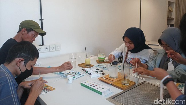 Kemudian setelah asyik berkeliling dan menggambar sketsa, para peserta tur pun diberikan kesempatan untuk melukis hasil gambar mereka dengan menggunakan cat berjenis gouache yang dinilai lebih mudah digunakan dibanding cat air pada umumnya.
