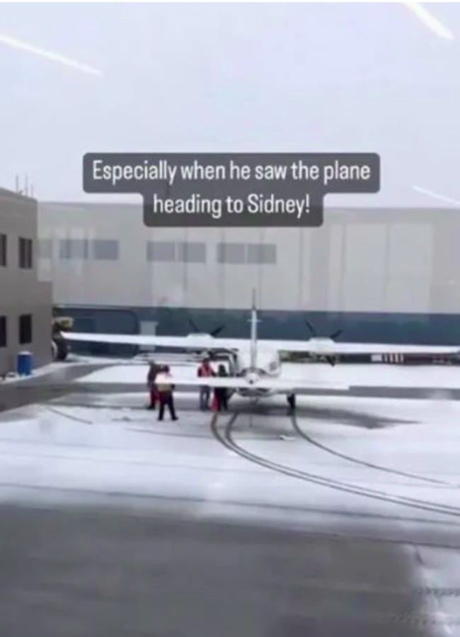Begitu mendarat, tumpukan salju menyambut Burnett. Dia harus melanjutkan perjalanan ke Sidney, Montana, AS dengan menggunakan Cape Air Jet kecil yang sedang menunggu di depannya.