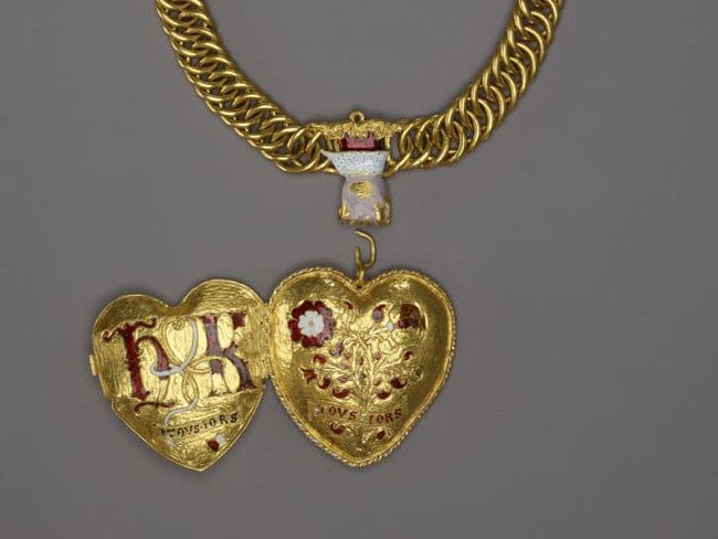 Liontin kuno ini menampilkan simbol Raja Tudor Henry VIII dan istri pertamanya Katherine dari Aragon. Rantai kalungnya terdiri dari 75 mata rantai, diikat oleh sebuah mata rantai berenamel berbentuk tangan. Katherine menikahi Henry pada tahun 1509 dan menjadi istri pertama dari enam istri Henry VIII.