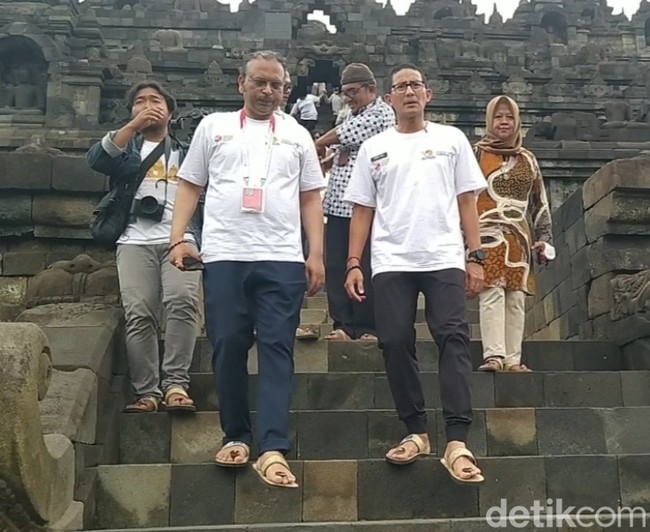 "Di mana paketnya juga meliputi sandal upanat yang sesuai dengan relief Borobudur, untuk menahan degradasi dari batu batuan candi dan juga paket Informasi, paket pemandu wisatanya dan juga mendapatkan tas, dan juga seluruh paket tersebut saya cek kpd pelaku parawosata dan ekonomi kreatif, di daerah sekitar Borobudur," kata Sandiaga.