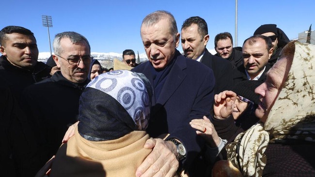 Erdogan melakukan kunjungan pertama ke wilayah yang paling parah terkena dampak Turki, Provinsi Hatay, pada Kamis (9/2) sejak gempa berkekuatan magnitudo 7,8 dan disusul gempa dengan kekuatan hampir sama itu.