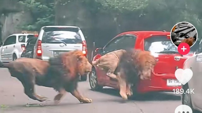 Sebuah video perkelahian dua ekor singa heboh di media sosial. Dua singa itu kemudian menyundul mobil pengunjung.