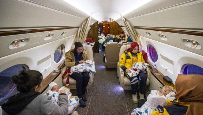 Dalam sebuah foto yang diterbitkan kantor berita pemerintah Turki, belasan bayi tersebut tampak tertidur dengan dibalut selimut tebal di dalam sebuah pesawat jet.