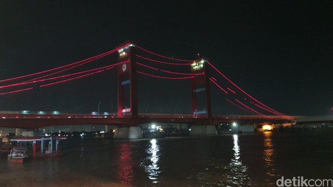 Pantauan detikSumut, Jembatan Ampera yang menghubungkan Seberang Ulu dan Seberang Ilir Palembang gelap gulita. Tak ada cahaya berwarna merah di sisi kanan dan kiri Jembatan Ampera.