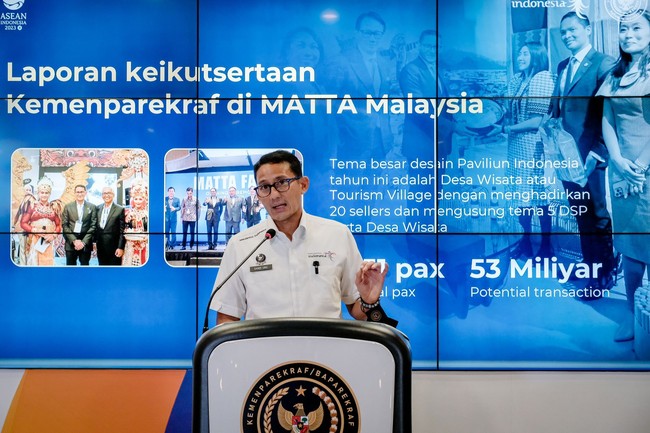 Menteri Pariwisata dan Ekonomi Kreatif (Menparekraf) Sandiaga Salahuddin Uno mengungkapkan keikutsertaan Indonesia dalam Malaysia Association of Tour and Travel Agent (MATTA) Fair 2023 di Kuala Lumpur, Malaysia membuka potensi transaksi hingga Rp 5,3 miliar. Dari acara itu, ada 1.351 potensi paket pariwisata ke Indonesia yang bisa terjual.