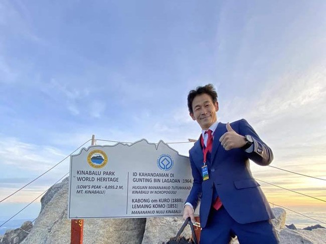 Pria Jepang ini punya cara unik saat mendaki Gunung Kinabalu di Malaysia. Ia mengenakan setelan jas lengkap layaknya pegawai kantoran.