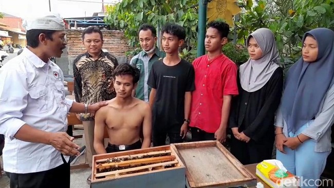 Komunitas Peternak Lebah di Kota Tegal, Jawa Tengah, mengajarkan terapi sengat lebah kepada para pelajar dan mahasiswa. Katanya sih menyehatkan.